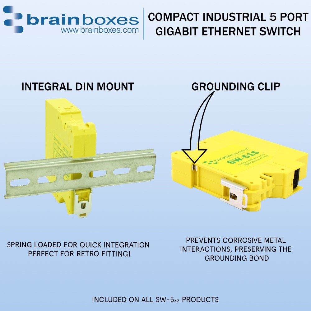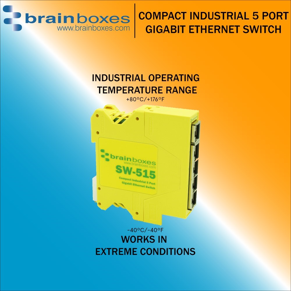 Compact industrial 5 port Gigabit Ethernet unmanaged switch.