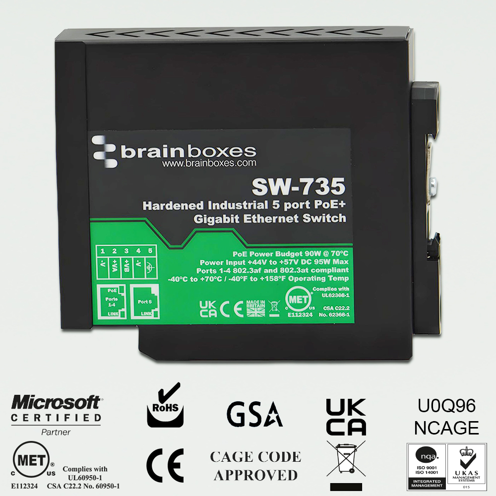 | PoE Ethernet | 4 Ports of PoE Ethernet and 1 Ethernet Interface takes advantage of a companies pre-existing infrastructure, allowing you to connect to your Brainboxes device over the local network, or from across the world, without the need for added power supplies and generators. |