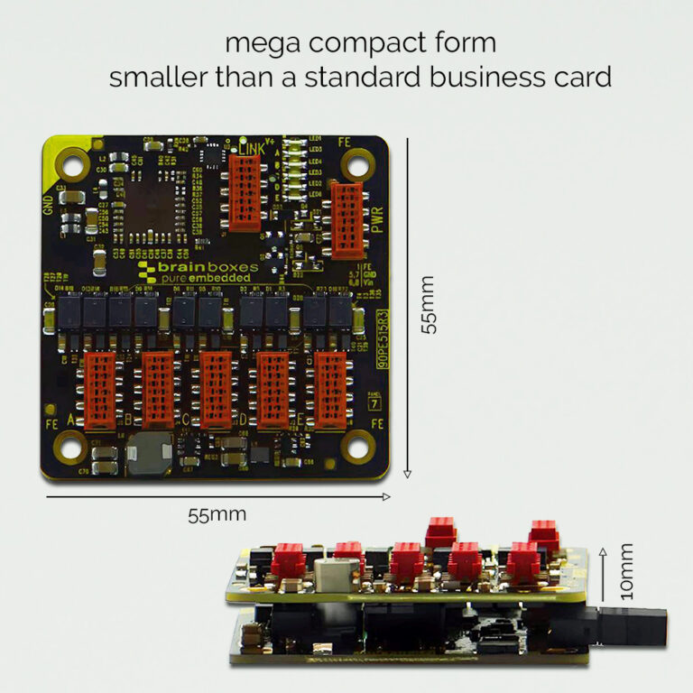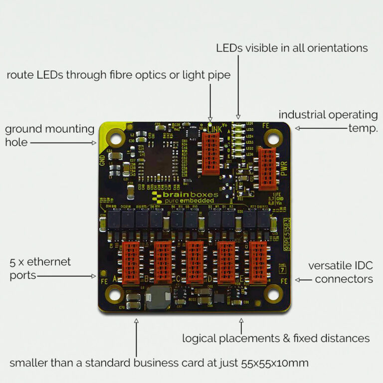Pure compatibility, pure stability, pure design. The perfect fit for any stable, future-proof system, even where space is limited.PE-515 Pure Embedded Industrial 5 Port Gigabit Ethernet Switch has a mega compact form – at 55 x 55 x 16mm / 2.17 x 2.17 x 0.63in it’s smaller than a standard business card.3D CAD files and PCB footprints, combined with logical placements and fixed distances, provide seamless integration with design software.Board-to-board and board-to-cable connection options, with LEDs visible in all orientations, with the option of routing through fibre optic light pipes, or by electrical signal wired out of the connector
