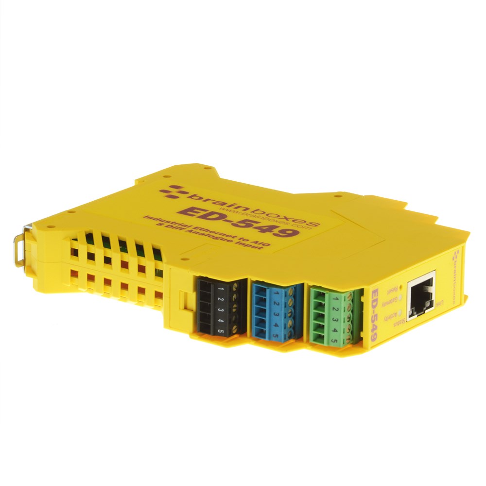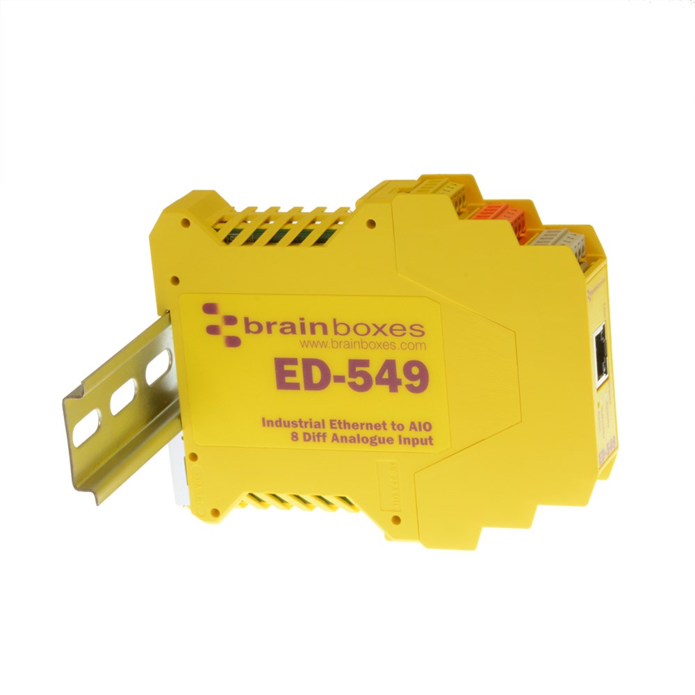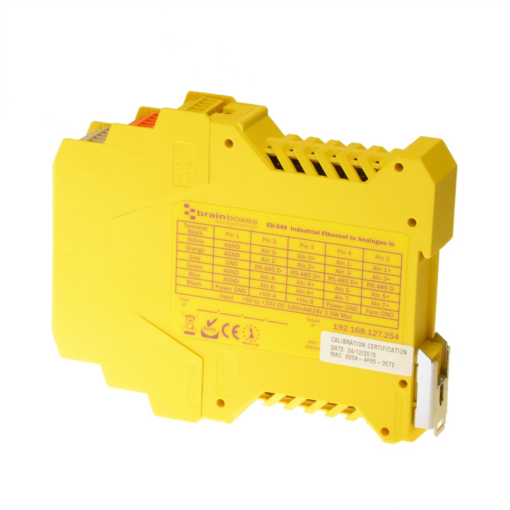 Ideal for all kinds of industry standard sensors and transducers. The ED-549 has 8 Analogue Inputs + RS485 Gateway. It is suitable for high-precision measurements of voltages and currents. Most parameters in the real world are measured using sensors generating analogue outputs. Brainboxes ED-549 takes these real world signals and turns them into data on your network. As well as the popular 0-10V and 4-20mA input devices, the inbuilt Programmable Gain Amplifier (PGA) allows full scale signals as small as ±75mV to be resolved to 12 bit accuracy across 8 analogue inputs. Each channel is individually configurable for voltage or current input with its own programmable gain.