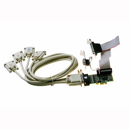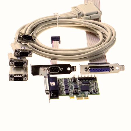 PCI Express card providing five RS232 serial ports and one LPT printer port. Four RS232 ports are delivered via a quad cable, one additional RS232 port via fly lead, plus a 25 pin D LPT port on a fly lead.